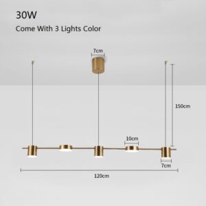 Dimension: 120cm Material: Metal Color: Gold Power Rating: 30W (come with tricolor lights) Voltage: 110V-250V Light Source: LED Bulb Suitable Space: 10-25 square meter Apply to:  Kitchen,Bar,Room,Home,Hotel,Warehouse,Restaurant,Coffee Shop…