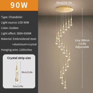 Dimension: Shade Size:5x30cm ,Ceiling Cover Size:50cm Material: Metal and Crystal Color: Gold Power Rating: 90W (come with remote control) Voltage: 110V-250V Light Source: LED Board Suitable Space: 20-45 square  meter Apply to:  Kitchen,Bar,Room,Home,Hotel,Warehouse,Restaurant,Coffee Shop…